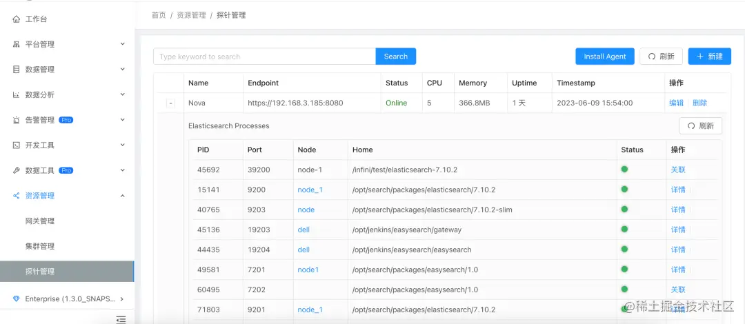 INFINI Agent 是 INFINI Console 的一个可选探针组件,负责采集和上传集群指标和日志等信息,并可通过 Console 管理。Agent 支持主流操作系统和平台,安装包轻量且无任何外部依赖,可以快速方便地安装。