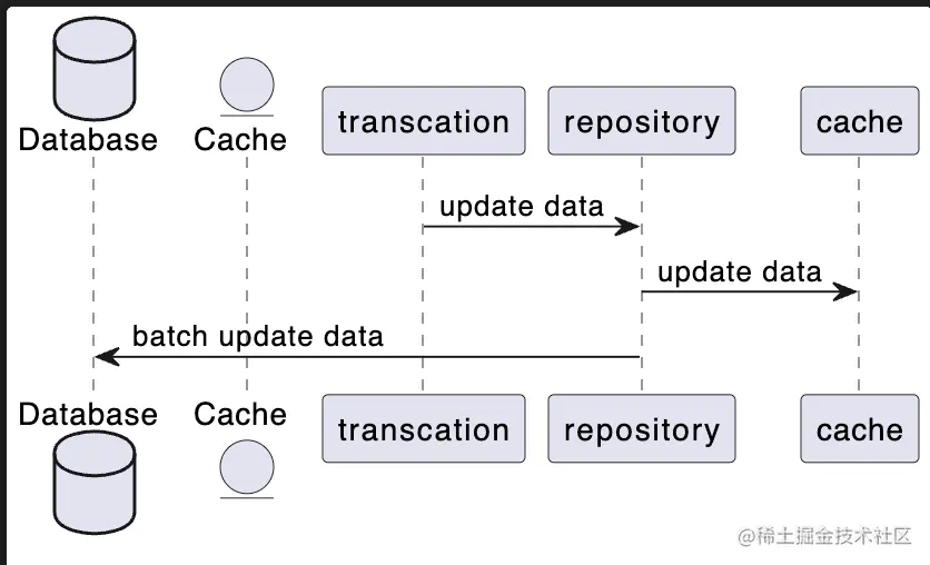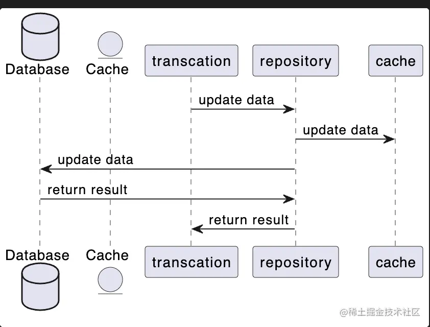 @startuml Database Database as DB entity Cache as Cache transcation -> repository: update data repository -> cache: update data repository -> DB: update data DB -> repository: return result repository -> transcation: return result @enduml