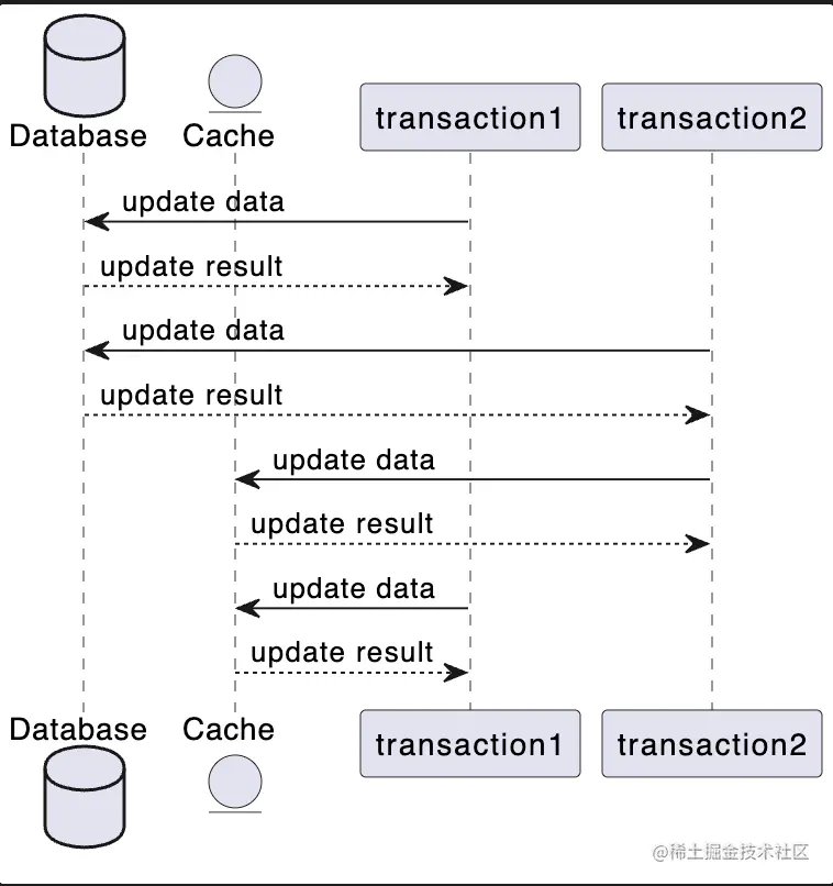 - 缓存与数据库是两套中间件,存在网络抖动之类的原因导致没有更新任一方的可能