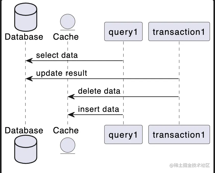 - 如图所示,更新请求先删除缓存,查询请求从缓存获取不到数据从数据库获取数据(老数据)加载到缓存中,更新请求更新数据库