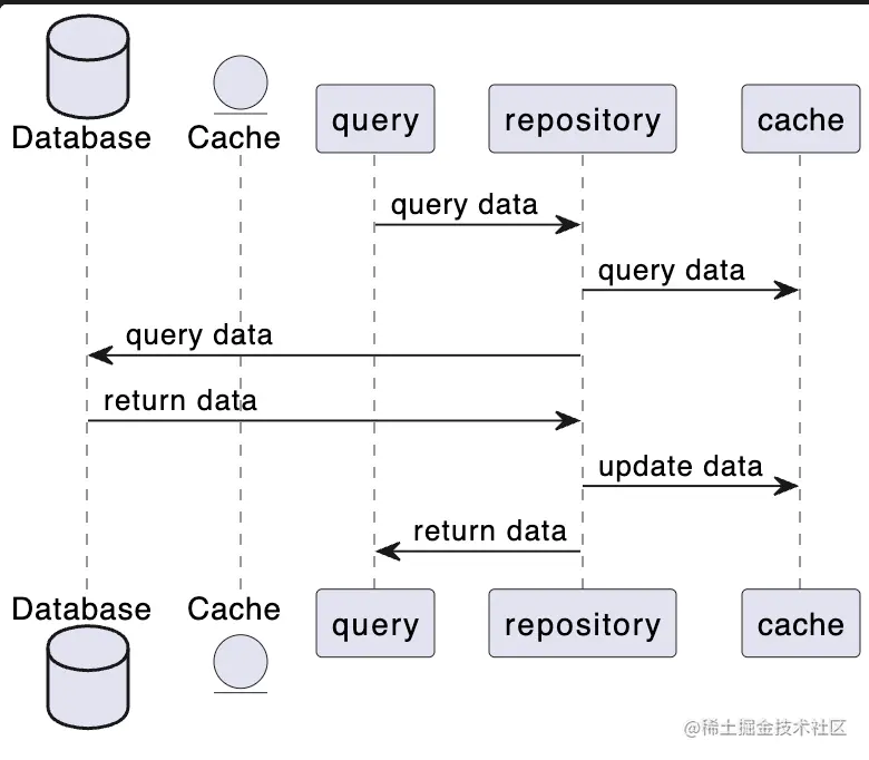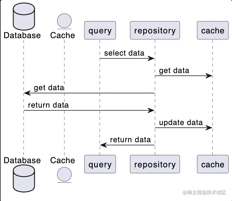 @startuml Database Database as DB entity Cache as Cache query -> repository: select data repository -> cache: get data repository -> DB: get data DB -> repository: return data repository -> cache: update data repository -> query: return data @enduml- wirte though