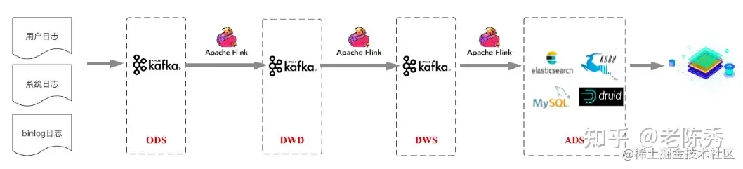 对于第一类实时数据场景来说,业界通常的做法比较简单粗暴,一般也不需要非常仔细地进行数据分层,数据直接通过Flink计算或者聚合之后将结果写入MySQL/ES/HBASE/Druid/Kudu等,直接提供应用查询或者多维分析。如下所示: