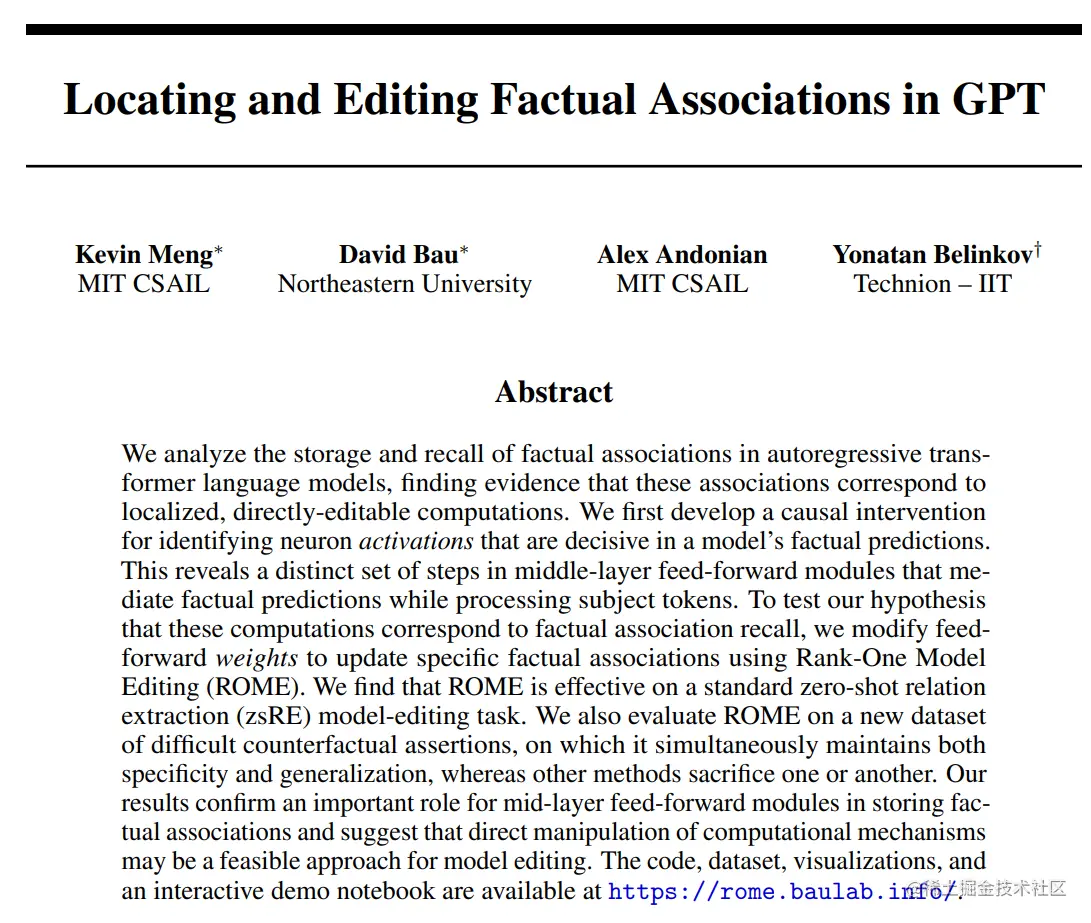 研究 Transformer 中事实知识存储修改与编辑的《Locating and Editing Factual Associations in GPT》,这篇我们做了解读(传送门:MIT发现语言模型内的事实知识可被修改??)