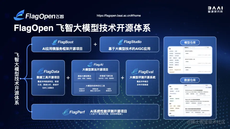 - FlagOpen飞智大模型技术开源体系:集成了一个完整的大模型算法技术仓库,从零开始也能 Follow 大模型的基础工作;