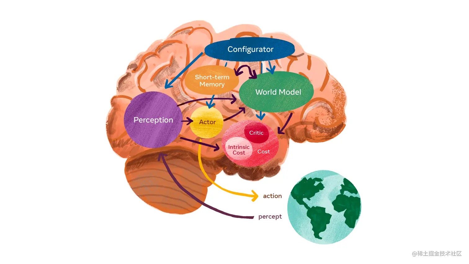 答案就是 Yann LeCun 教授最近反复强调的“世界模型”,教授构想的可以支持推理与规划的真正的“智能体”应该包含以上六个组件,分别是配置器(Configurator)模块,感知模块(Perception module),世界模型(World model),成本模块(Cost module),Actor 模块,短期记忆模块(Short-term memory module)。