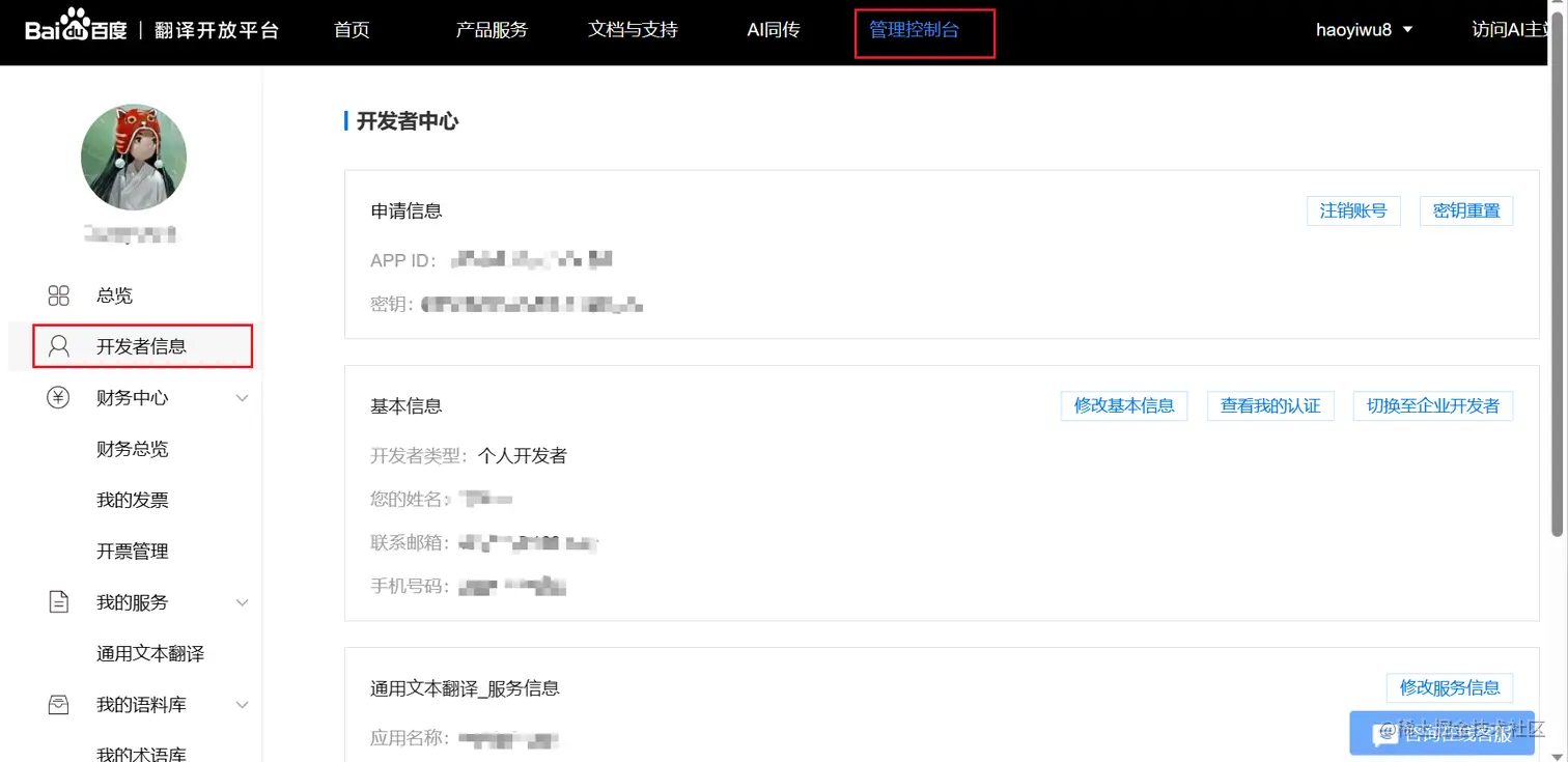 点击“管理控制台”,打开“开发者信息”界面: