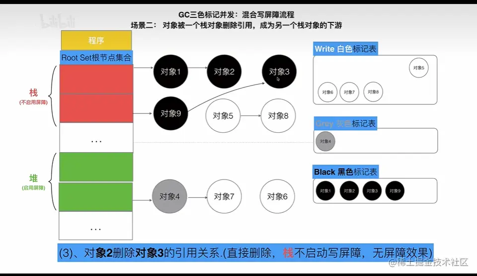 具体操作:被删除的对象,如果自身为灰色或者白色,那么标记为灰色