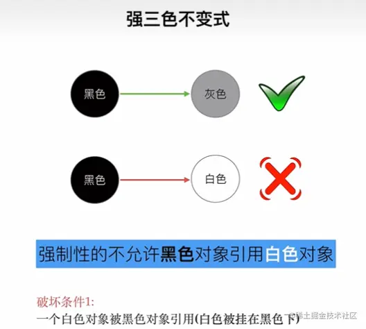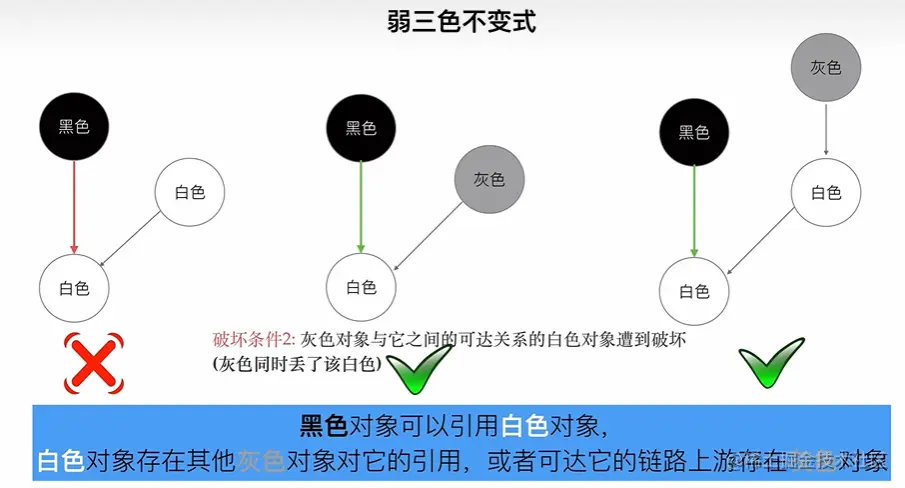 黑色对象可以引用白色对象,白色对象存在其他灰色对象对它的引用,或者可达它的链路上游存在灰色对象