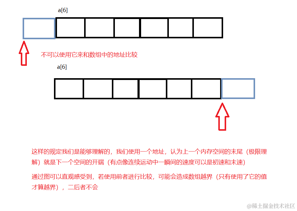 标准规定:允许指向数组元素的指针与指向数组最后一个元素后面的那个内存位置的指针比较,但是不允许与指向第一个元素之前的那个内存位置的指针进行比较。