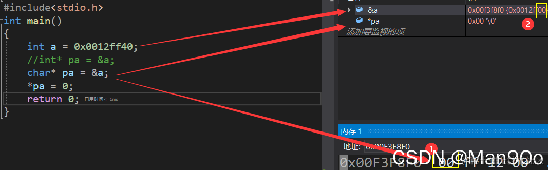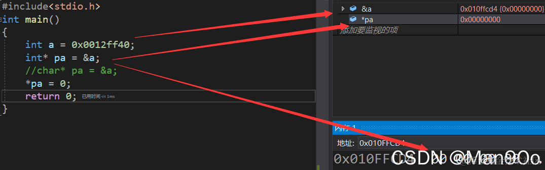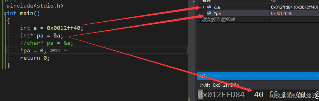 #include<stdio.h> int main() { int a = 0x0012ff40; int* pa = &a; //char* pa = &a; *pa = 0; return 0; }