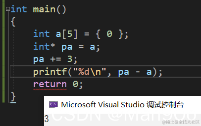 下面我将a的首地址赋给pa,然后将pa的值+3,打印两个地址之差