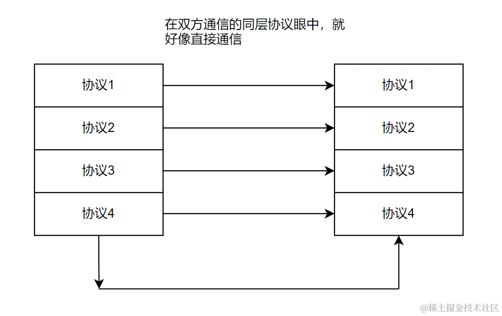 在网络中,对于通信的双方,它们都有各自的协议栈,数据的处理、传输路径也很复杂,但是在双方的同一层协议的眼中,数据交流就像打电话一样,是直接通信的。