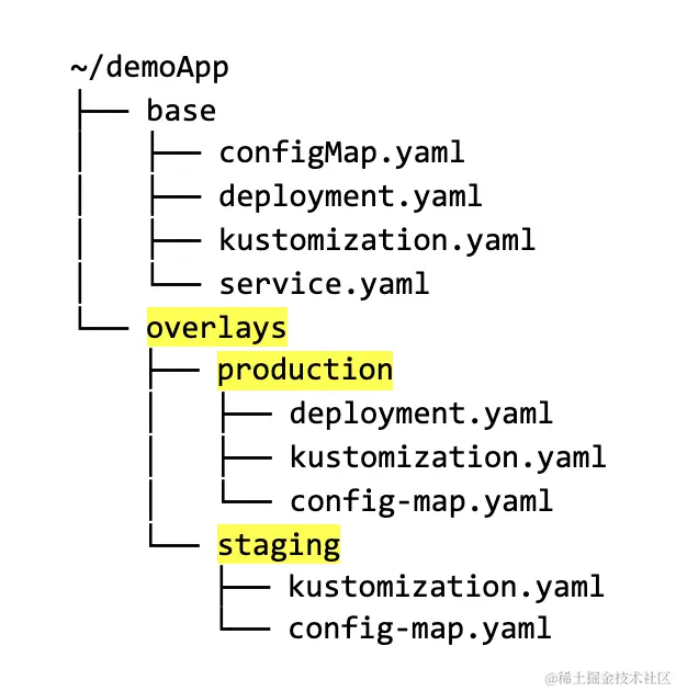 对于Kustomize,需要创建一个“base”配置,然后每个环境被建模为一个overlay,有自己的文件夹: