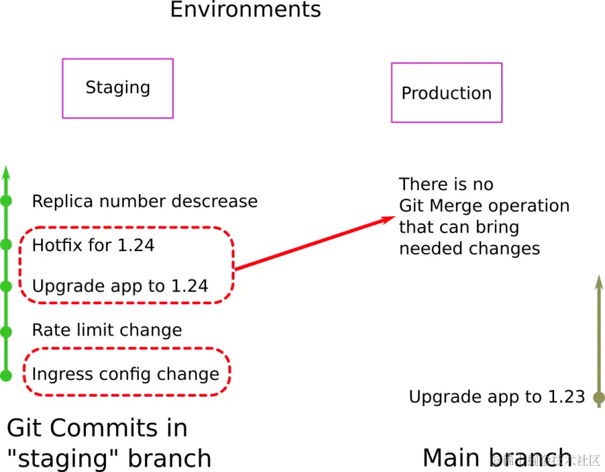 在上面的示例中,版本1.24必须部署到生产环境。问题是其中一个提交(hotfix)包含了大量的变更,而其中某些变更又依赖于另一个提交(ingress配置变更),而后者本身无法部署到生产环境(因为只适用于预发环境)。因此,即使是精心挑选,也不可能只将所需的变更从准备阶段引入到生产阶段。