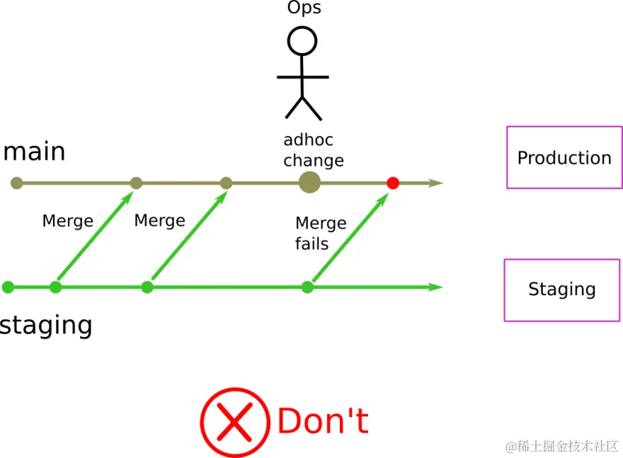 既然我们已经了解了在部署中使用按环境区分分支的方法的历史,就可以讨论其缺点了。