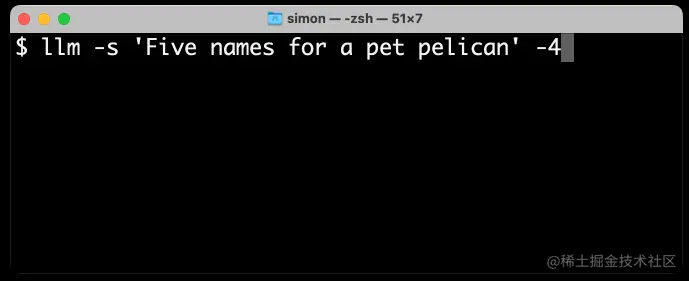 这是我得到的 - 使用我的 llm CLI 工具从 GPT-4 生成文本:llm -s 'Five names for a pet pelican' -4