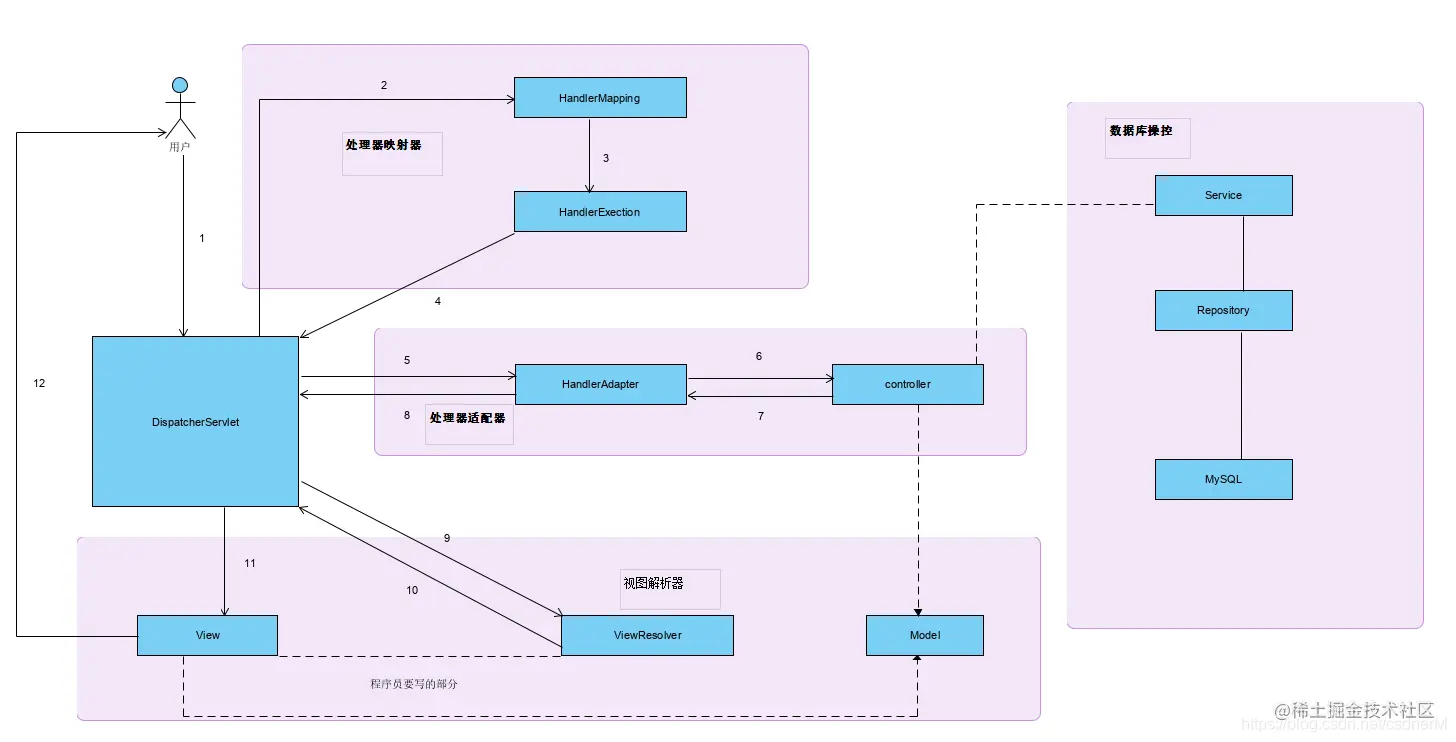 一旦 Controller 处理完请求并安排好视图呈现以及其他返回数据的功能,他们会通过一个 ModelAndView 模型,向 HandlerAdapter 传递请求处理结果。