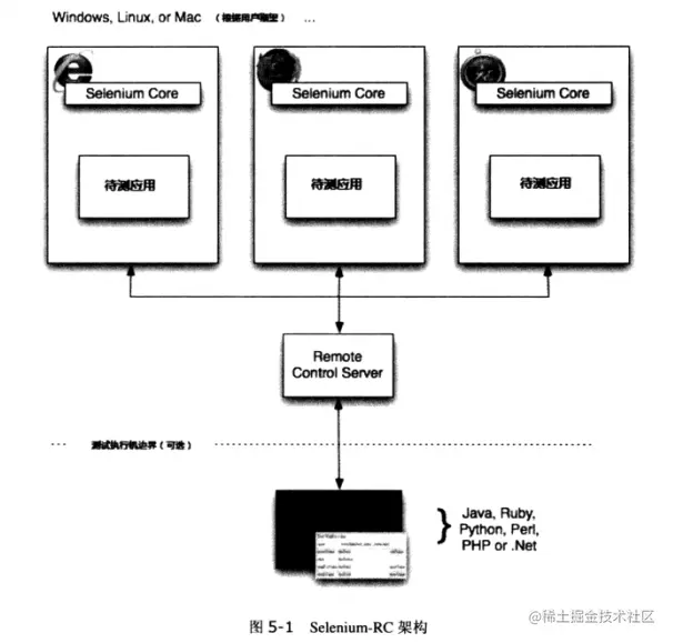 Selenium-RC的一个简单的架构图,如图5-1所示。