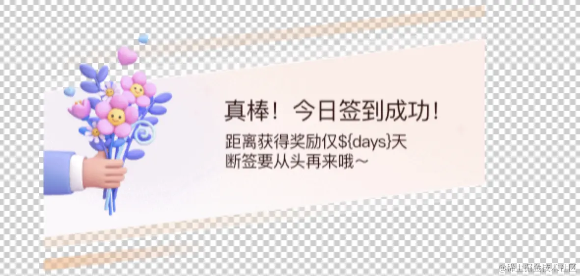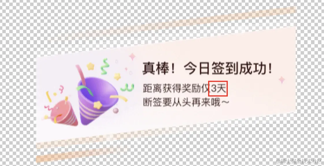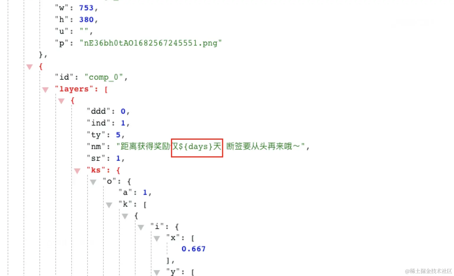 比如在某次运营活动中,有个每天打卡得奖励的活动,每天打卡后我们展示一个动画,提醒用户举例获取奖励还有几天,从而激励用户每天打卡。为了实现这个效果肯定不能让设计师产出10套动画json文件吧,理想情况下是不是动态去替换这里的文本内容更好呢?