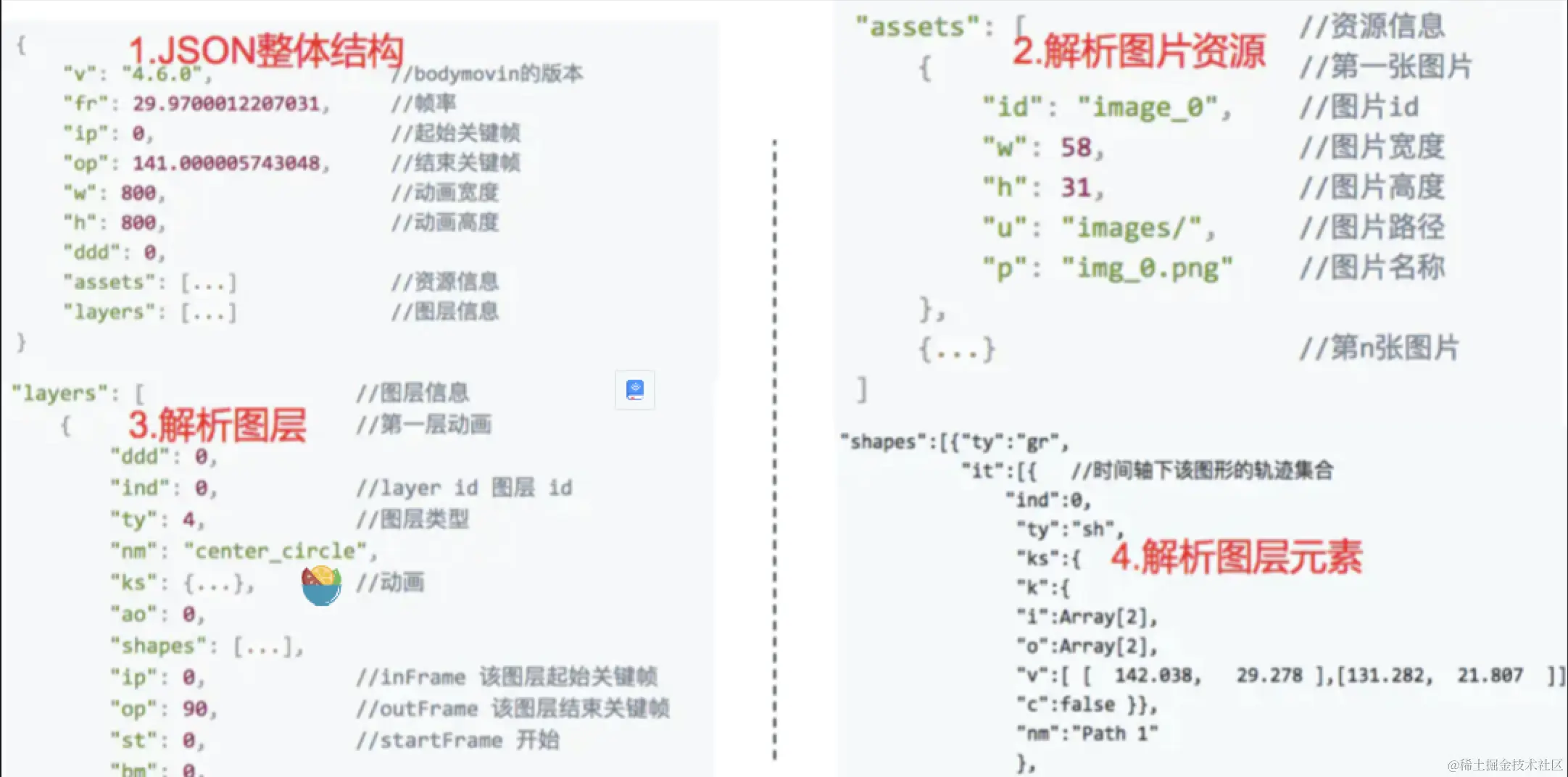 由上面的动画绘制流程可知,lottie动画的关键在用解析json结构,那么这个json文件到底有哪些什么之处呢?我们接着往下探索。