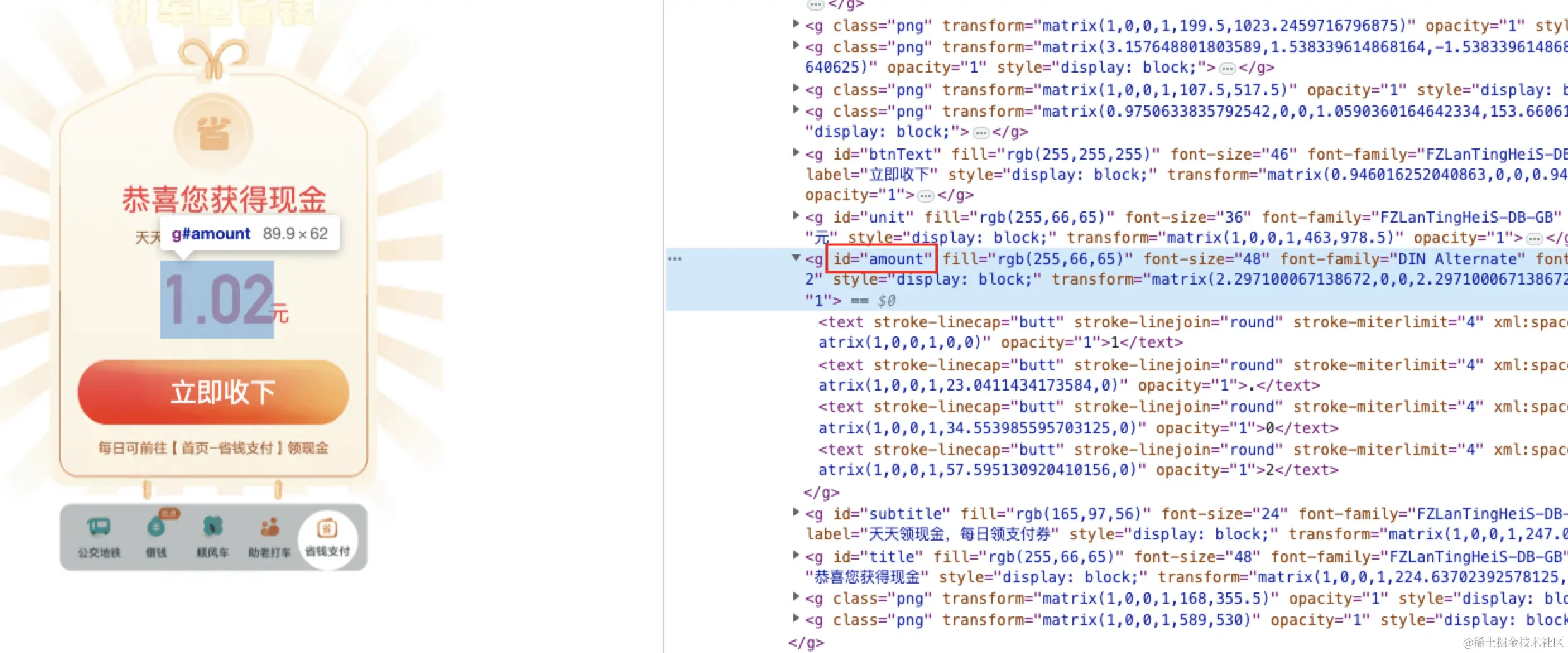 要替换的金额部分,渲染的dom节点有个id为 "amount" 的唯一标识,那么我们就可以通用getkeyPath通过这个唯一id获取到对象,最终通过js修改的方式如下: