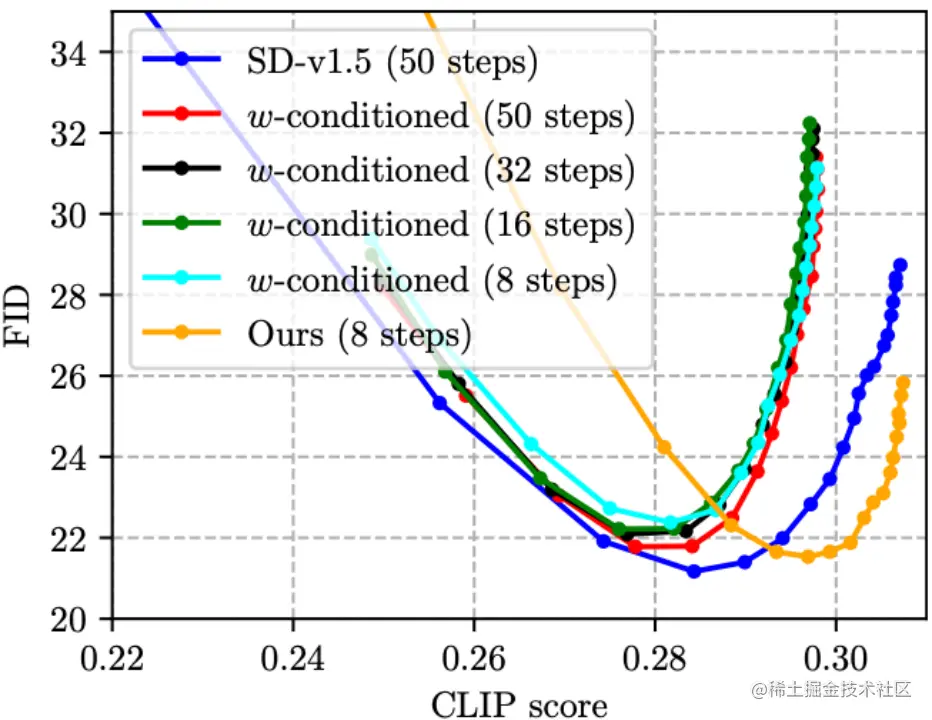 (2)CFG 虽然可以大幅提升图像质量,但代价是推理成本翻倍。今年 CVPR’23 Award Candidate 的 On Distillation 一文 [5] 提出 w-conditioning,将 CFG 参数作为 UNet 的输入进行蒸馏(得到的模型叫做 w-conditioned UNet),从而在推理时省却 CFG 这一步,实现推理成本减半。但是我们发现,这样做其实会造成图片质量下降,CLIP score 降低(如下图中,四条 w-conditioned 线 CLIP score 均未超过 0.30, 劣于 SD-v1.5)。而我们的方法则可以减少步数,同时将 CLIP score 提高,得益于所提出的 CFG-aware 蒸馏损失函数!尤其值得主要的是,下图中绿线(w-conditioned, 16 steps)与橙线(Ours,8 steps)的推理代价是一样的,但明显橙线更优,说明我们的技术路线比 w-conditioning [5] 在蒸馏 CFG guided SD 模型上更为有效。