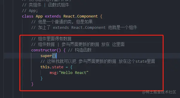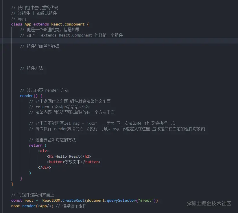 - render当中返回的jsx内容,就是之后React会帮助我们渲染的内容
