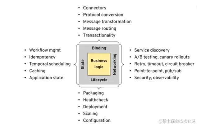 Red Hat 首席架构师 Bilgin Ibryam 提出了 multi-runtime 的理念。runtime 作为理论的出发点,Bilgin Ibryam 提出现代分布式应用程序的需求分为 4 类,分别是生命周期(lifecycle)、网络(networking)、状态(state)和绑定(binding)。