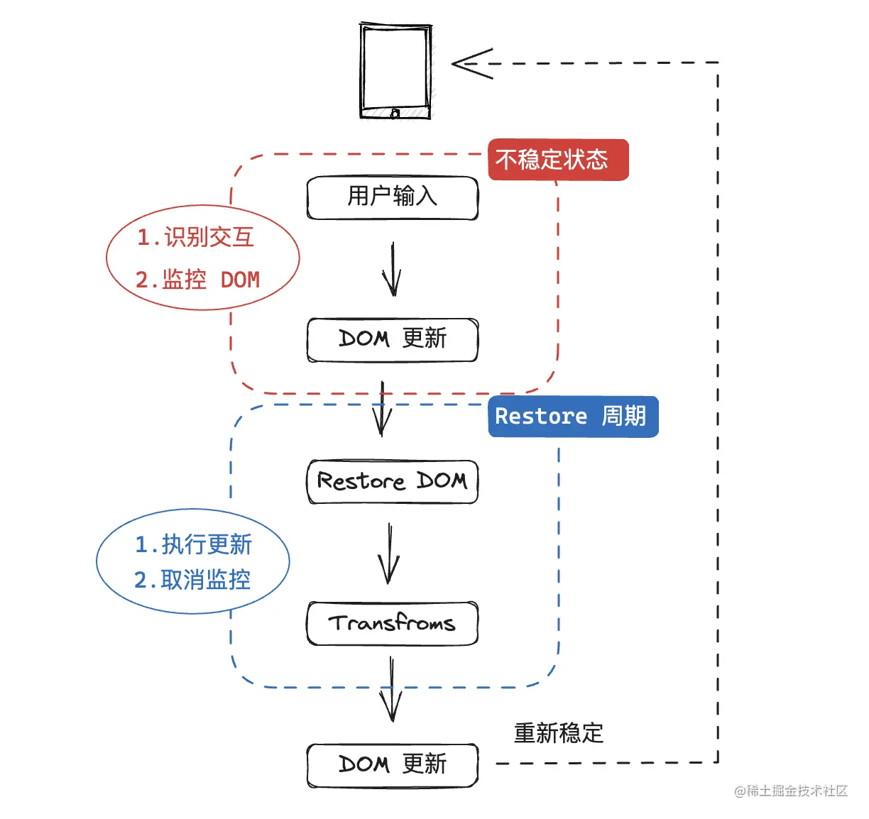 用户输入 -> DOM 更新(默认行为) -> 恢复 DOM -> 数据变换 -> DOM 渲染(数据驱动)