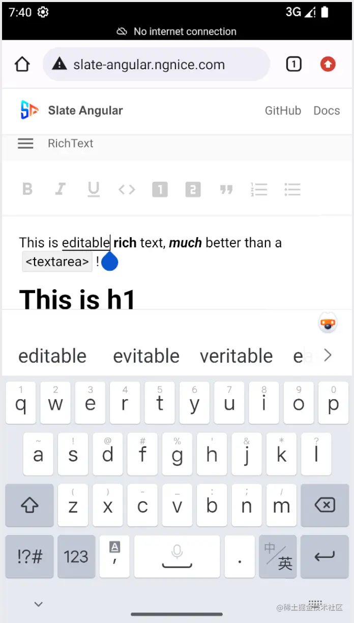 不知道大家有没有留意到手机输入内容时中文和英文的差异,就是在手机上进行英文输入时输入法会给出一个联想或者提示的功能,在正在输入的单词上出现一个下划线,如图(焦点在 editable 单词结尾处):