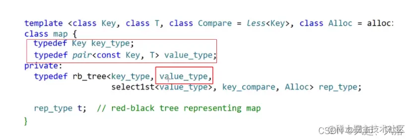 map与set在STL中实现是一样的 对于value_type,map的第二个模板参数是pair,而set的第二个模板参数是key 这样写是为了map和set使用同一颗红黑树去复用map和set