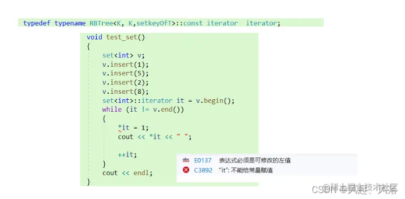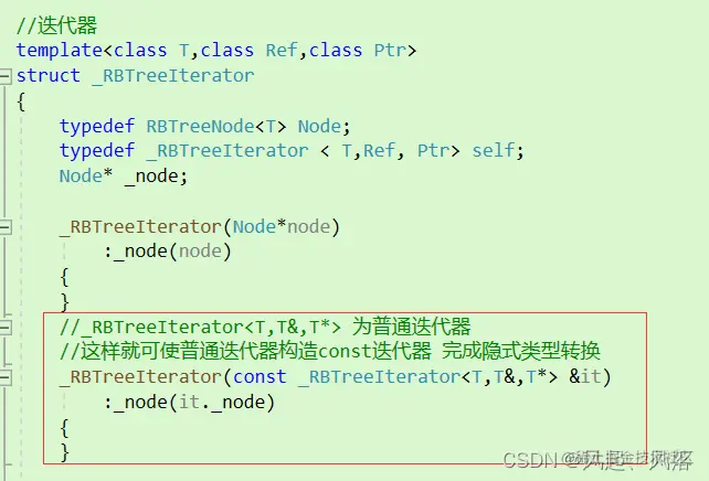 自己去实现一个普通迭代器类型,当类模板实例化为iterator时,则红框为拷贝构造 当类模板实例化为const_iterator时,通过发生隐式类型转换,使用普通迭代器构造const迭代器