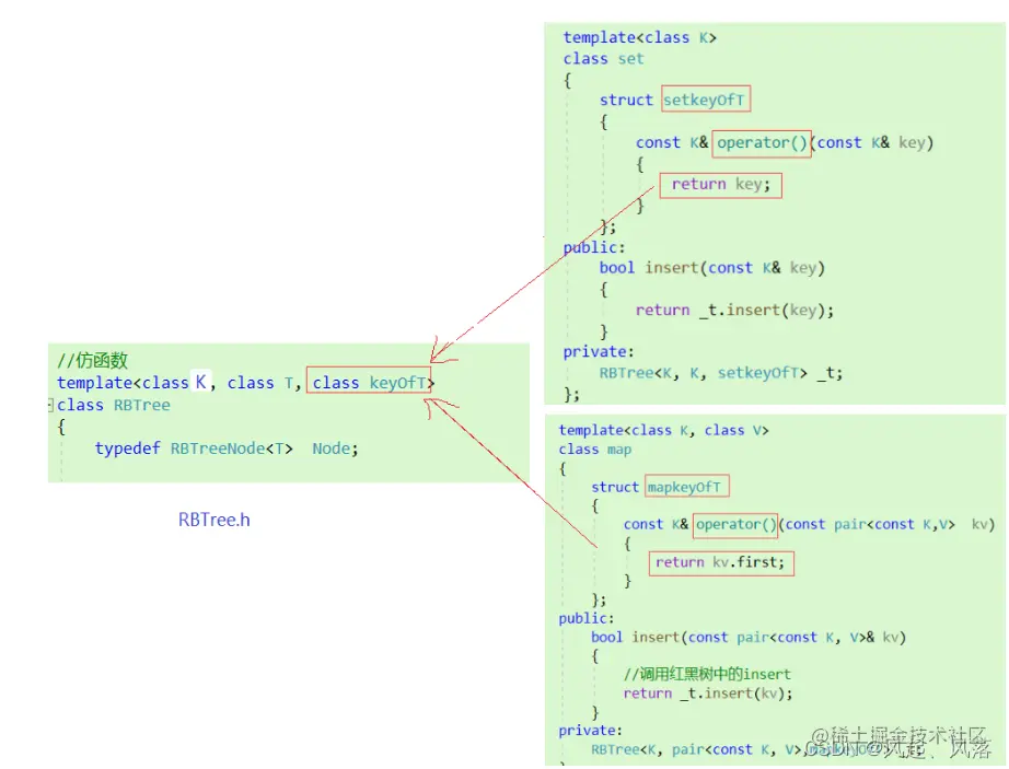 我们要把key取出来,但是在红黑树中并不知道调用的是 set 还是map,无法知道T代表什么 但是在使用set或者map内部是知道的,所以 分别在map和set内部各自创建一个内部类,其中都写一个operator()