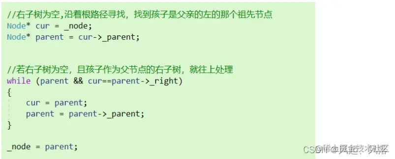 cur为当前节点,若cur的左子树为空,并且作为parent的右子树,则直接返回 parent节点