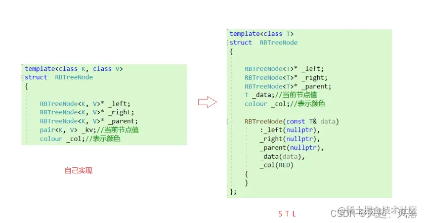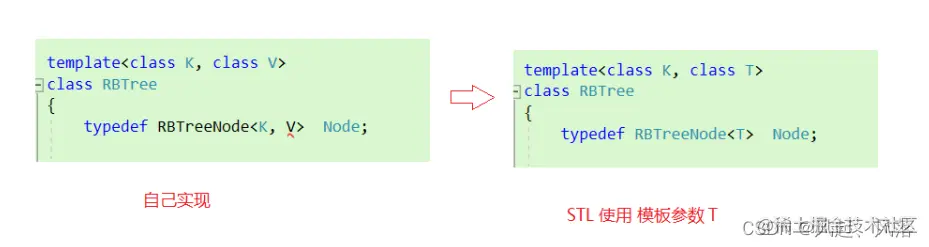 在结构定义时,为了让map与set都能调用同一颗红黑树,所以把模板参数改为T 当set要调用时,T变为<K,K> 当map要调用时,T变为<K,pair<const K,V>>