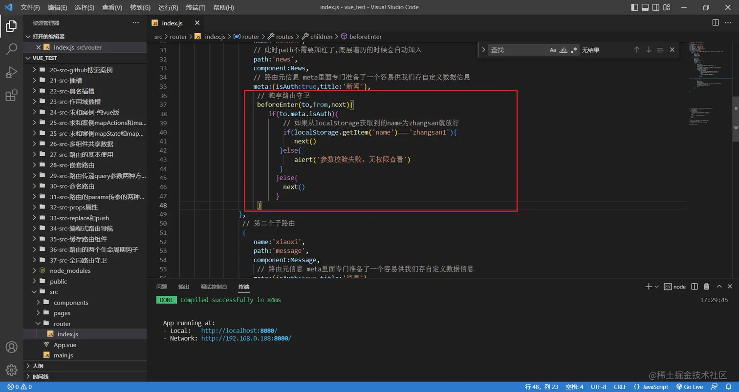 值得注意的是它是配置路由里面的一个属性,并且它只有前置没有后置,独享的前置路由守卫和全局的后置路由守卫可以配合使用
