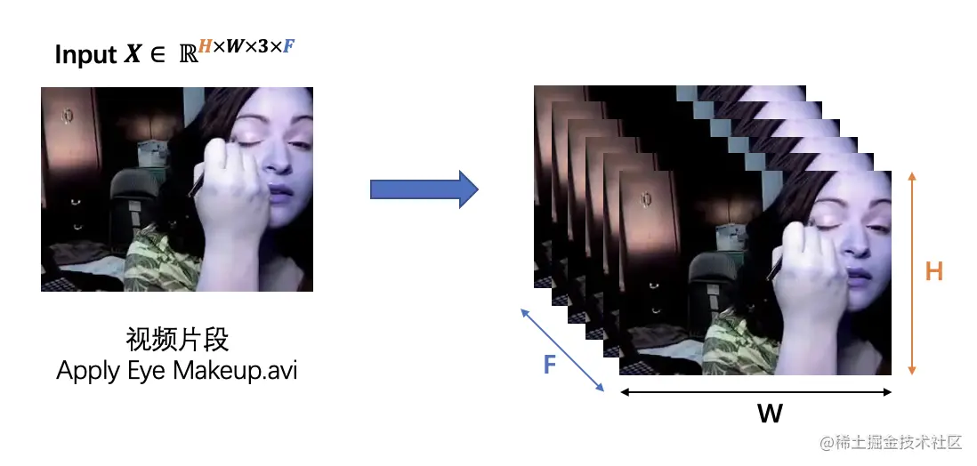 TimeSformer的输入 为一段视频片段,由 个从视频中采样的大小为 的 RGB 图片帧组成。