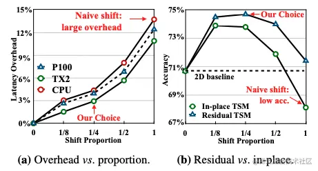 为检验上述假设,作者在 Kinetics 数据集上比较了 In-place TSM 和 Residual TSM 的性能。在 图2 b 中我们可以看到,对于所有比例的位移,Residual TSM 都具有更好的性能。同时,作者发现,性能与位移通道的比例有关:如果比例太小,则时间推理的能力可能不足以处理复杂的时间关系;如果太大,则会损害空间特征学习能力,选择1/4的通道偏移时,性能会达到峰值。