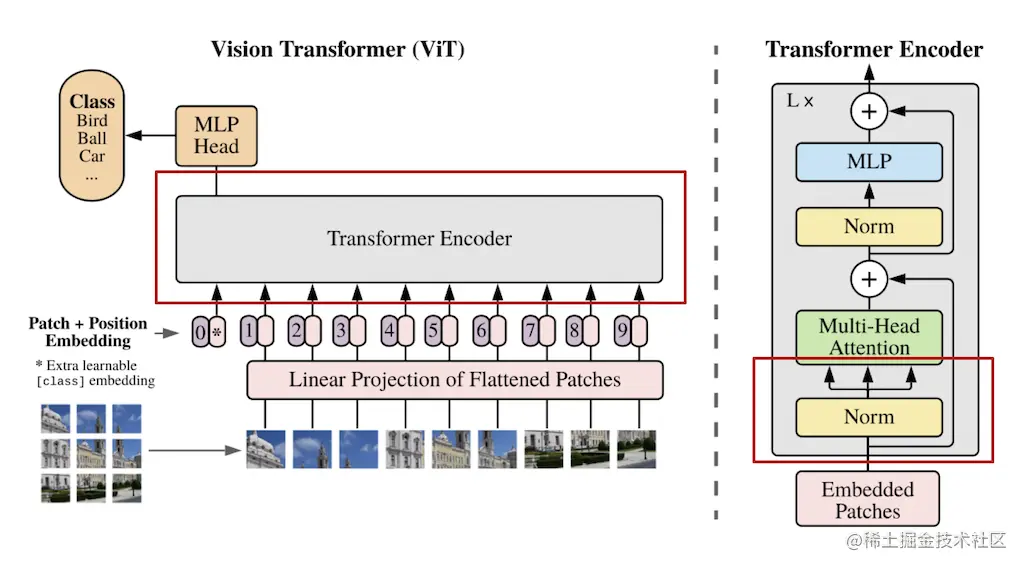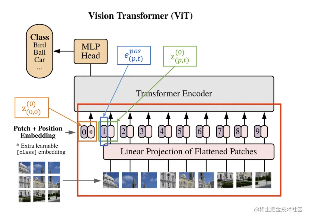 其中, 是一个可学习的矩阵, 代表一个可学习的位置embedding, 可以对每个图像块的位置信息进行编码。因为transformer的序列式处理方式减弱了空间位置关系,因此需要给每个图像块加上一个位置信息。 代表 transformer 结构的输入,同时,额外增加一个 来表示分类token的embedding,作为分类器的输入。