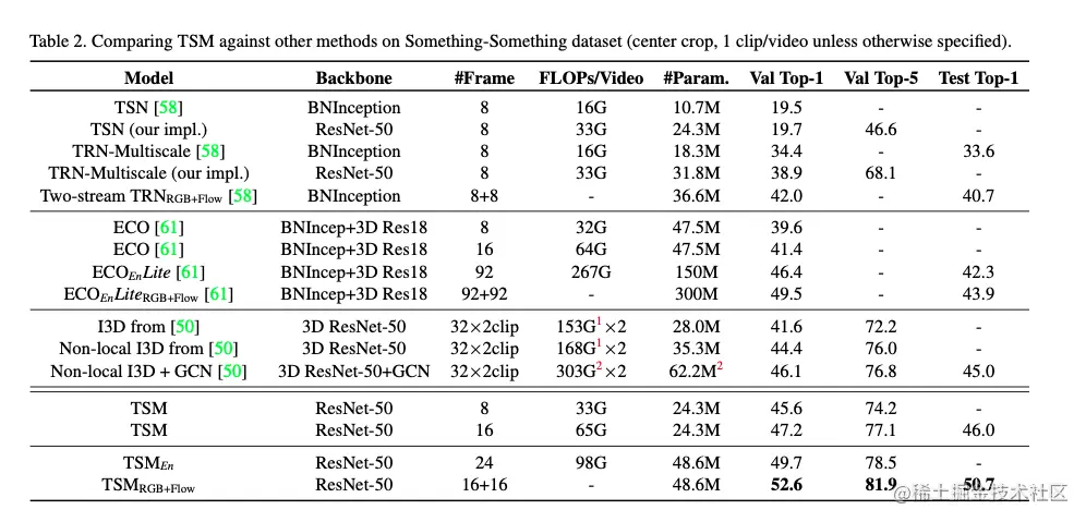 作者在Something-Something V1数据集上将TSM模型的性能与最先进的方法进行了对比。首先,由于TSN缺少时间建模,因此无法获得良好的性能。对于 TRN,虽然在特征提取后添加了后期时间融合,但其性能仍显著低于最先进的方法,跨所有层的时间融合的重要性。
