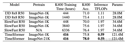 作者也对TimeSformer和SlowFast以及I3D在K400数据集上进行了比较,可以看到尽管TimeSformer的参数量较大但是其推理成本较低。同时,在ImageNet-21K上进行预训练,则可达到78%的分类准确率。