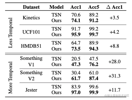 如 表1 所示,作者在不同的数据集上分别测试了TSN的精度和TSM的精度。该表格可分为两部分,上部分涉及的数据集在时间关系上没有那么重要,TSM的计算结果小幅度优于2D TSN基线。下部分数据集,Something-Something V1和V2 以及 Jester,它们很大程度上取决于时间关系,TSM在这些数据集上性能有大幅度的明显提升。