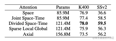 作者对不同的attention模块分别在Kinetics-400(K400)和Something-Something-V2(SSv2)数据集上进行了实验,实验结果如 表1 所示。可以看到,分离的时空自注意力在两个数据集上都达到了很好的效果。