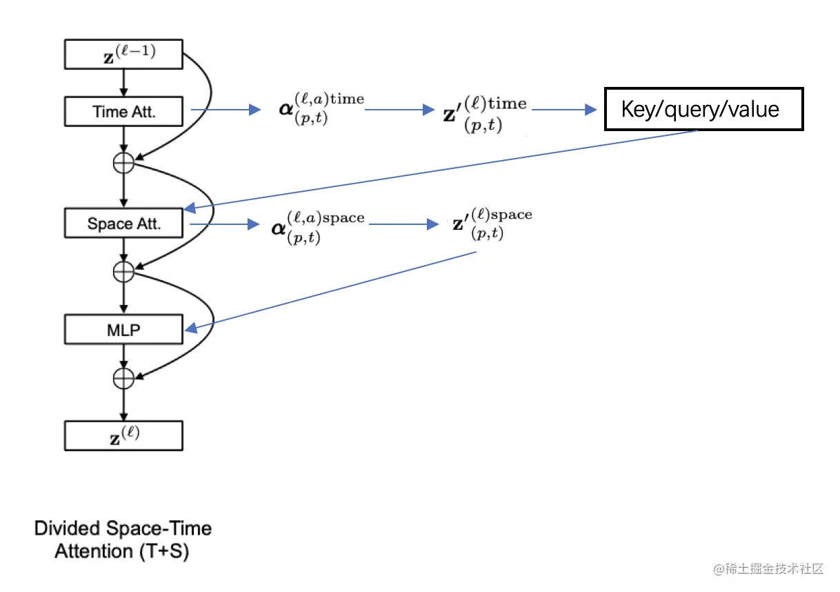 针对分离的时空自注意力模块,具体的计算流程如 图7 所示,在通过time attention获得 , 根据权重矩阵计算得到encoding 并由此计算出新的key/query/value向量。使用新得到的key/query/value来进行空间维度的计算,通过space attention得到 ,最终经过MLP层得到: