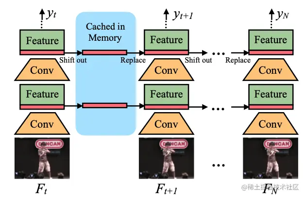 在线视频理解是现实生活中很重要的任务,单向TSM将特征从前一帧转移到当前帧。用于在线识别的单向TSM 推理图如 图4 所示,在推理过程中,对于每一帧,我们保存每个残差块的前 1/8 特征图并将其缓存在内存中,对于下一帧,我们用缓存的特征图来替换当前特征图的前 1/8。我们使用 7/8 当前特征图和 1/8 前一帧的特征图组合来生成下一层,并重复。