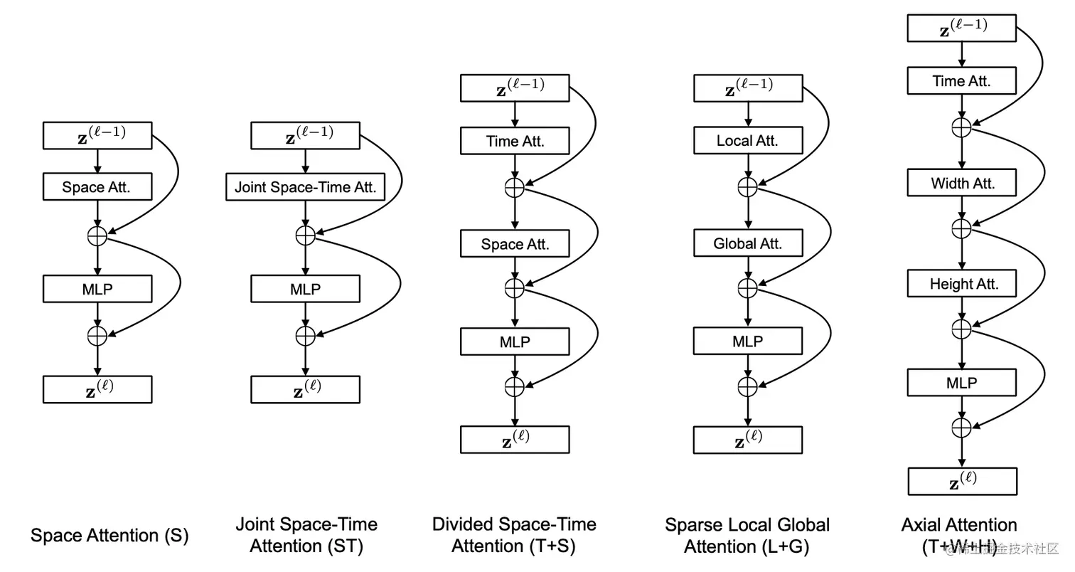 作者在实验过程中对不同的视频自注意力模块进行了调研。实验发现,单一维度的自注意力(只有时间维度或空间维度的自注意力)(S)相比于时空注意力模块(ST)极大的减小了计算量,但只采取单一的时间或空间维度进行自注意力计算,对于视频分类任务来说,势必会极大的影响模型的分类精度,因此,作者提出了一种 “Divided Space-Time Attention”(T+S),在先进行时间注意力后再进行空间注意力,不同的注意力模块结构 如图5 所示。对于分离的注意力,我们先将每一个图片块 与其他在相同空间位置但是不同时间帧的图像块进行对比(自注意力工作机制可视化 如图6 所示),得到权重矩阵 :
