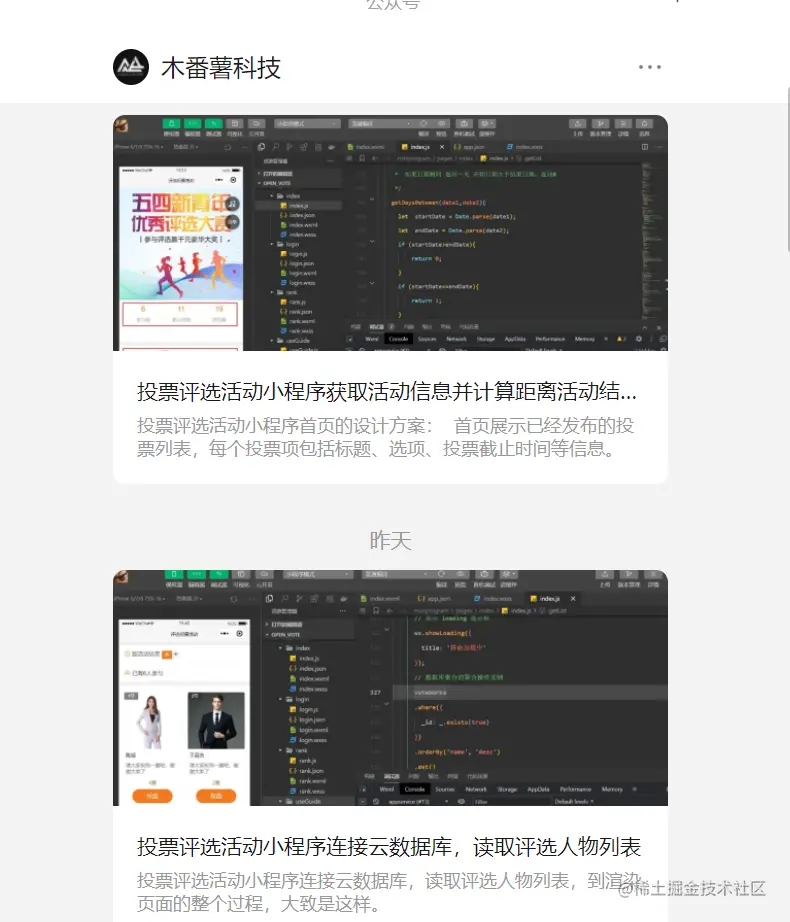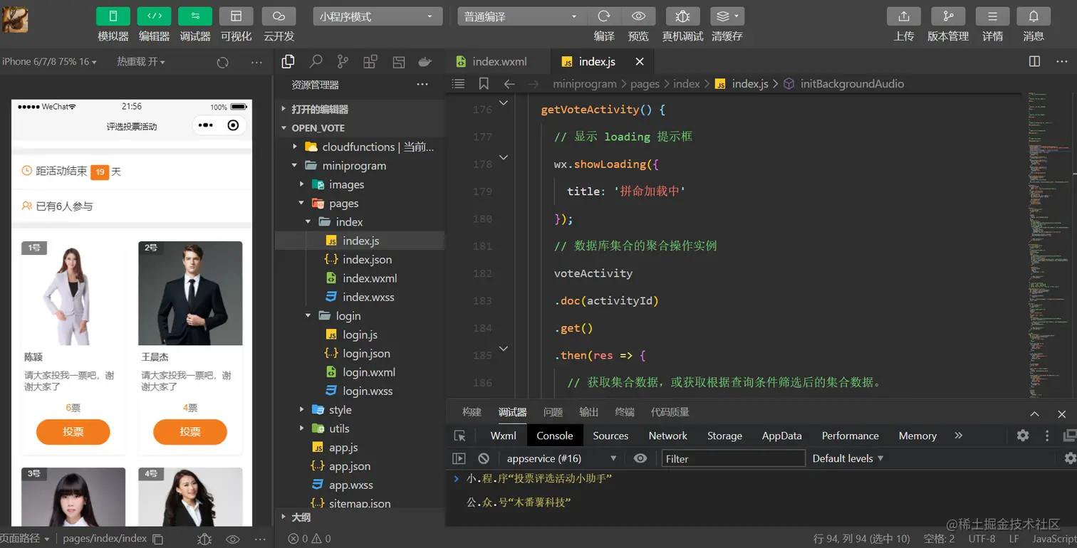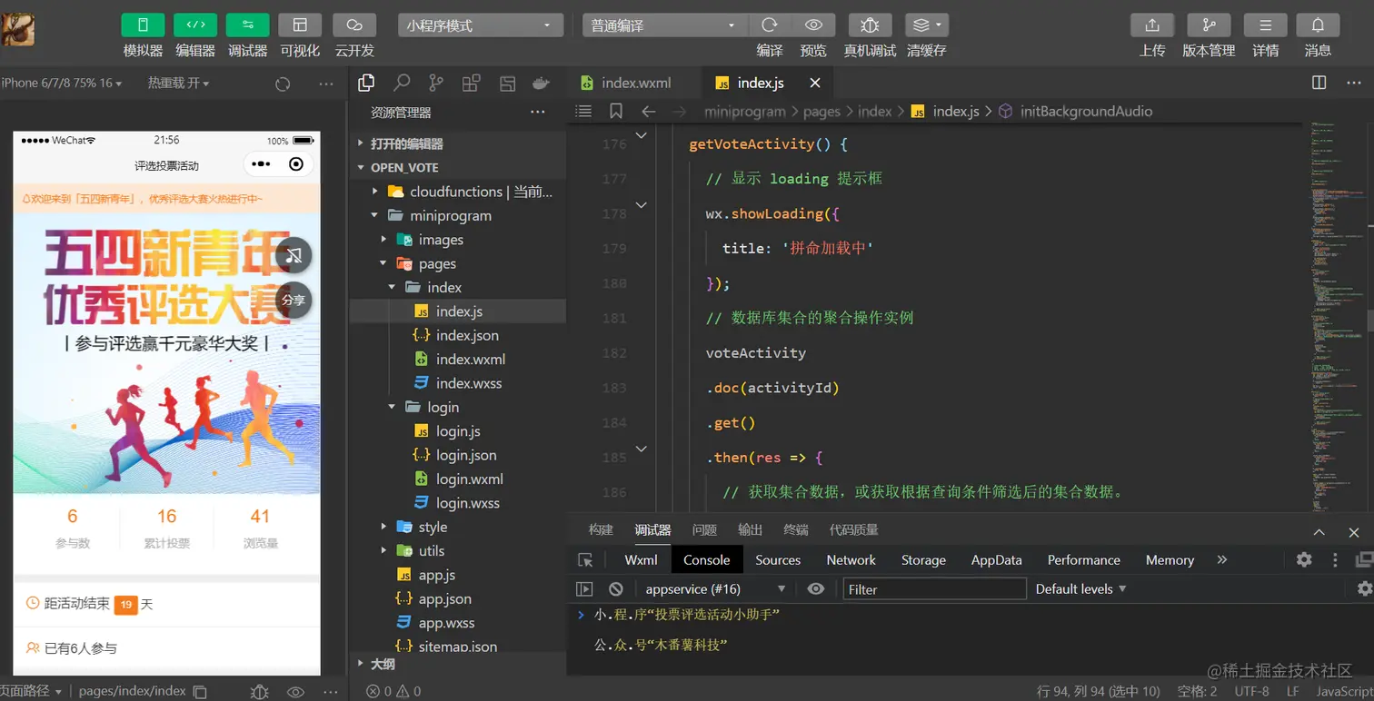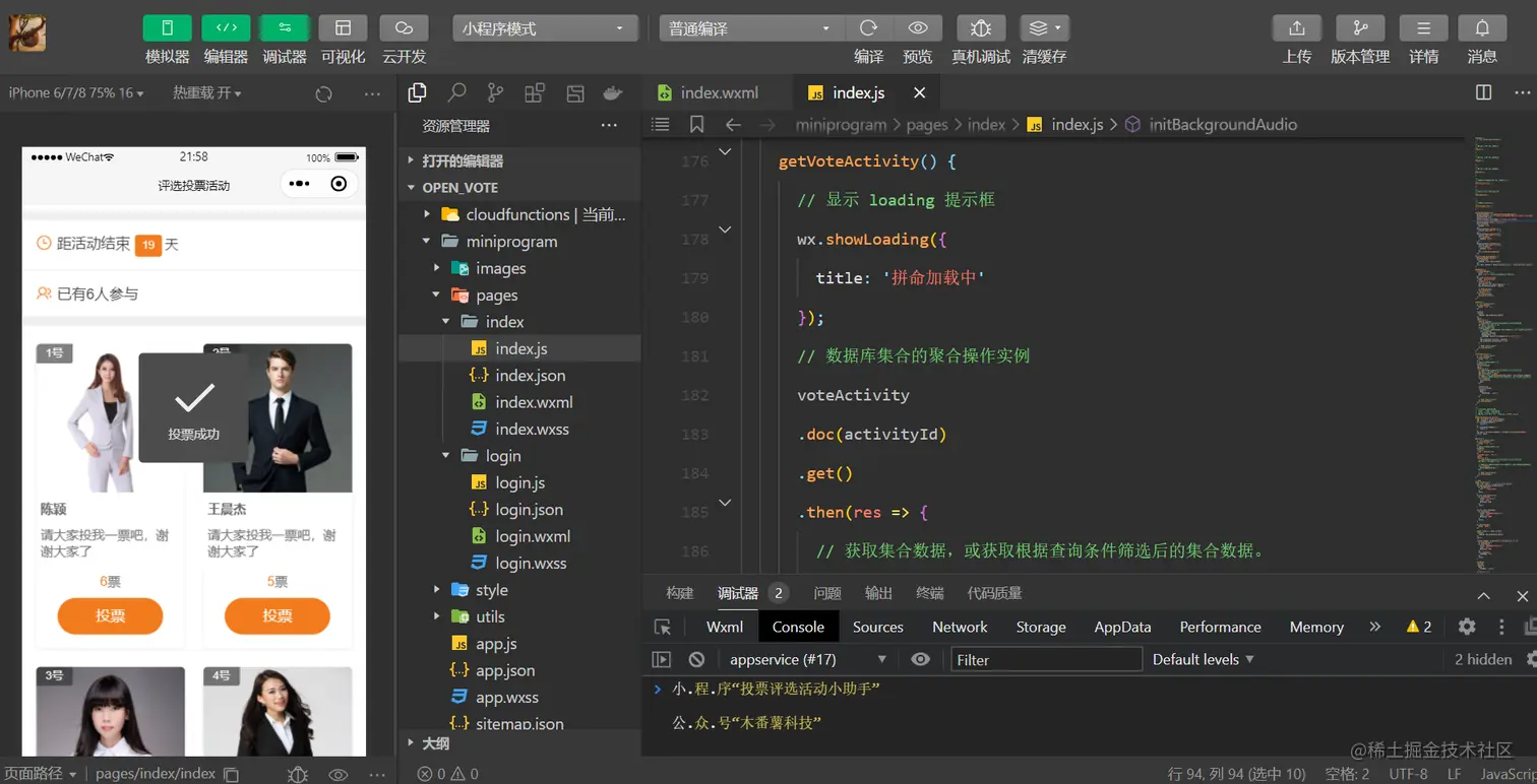 通过异步请求,读取voteActivity数据表的投票评选活动信息,这里使用了Collection.doc(),获取集合中指定记录的引用。方法接受一个 id 参数,指定需引用的记录的 _id。