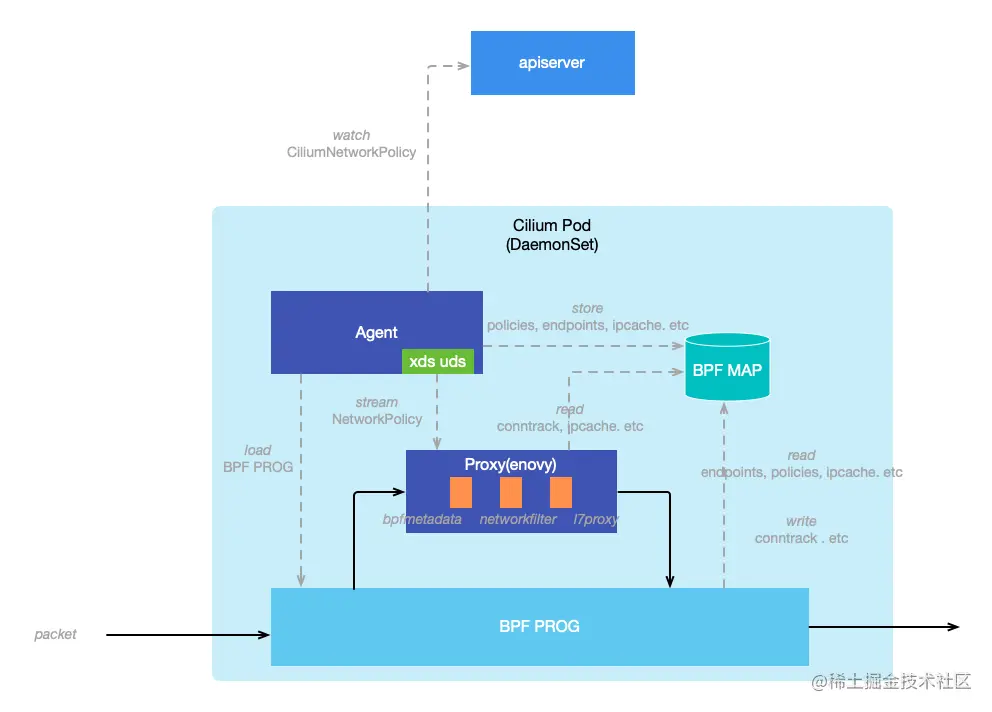 CiliumNetworkPolicywatcher。当策略创建或者更新时,Agent 会对策略进行转换并将规则存储到 BPF Map 中。在网络通信时,BPF 程序会对网络流量进行检查并决定应当允许或者拒绝访问。