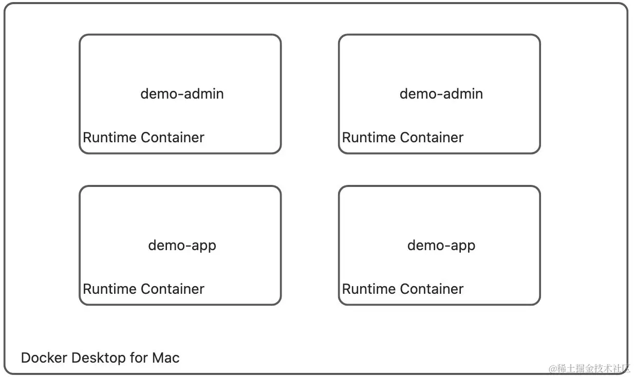 本例是以 Docker Desktop for Mac 为平台的,将演示项目以单集群形式部署,项目包含两个 Java Web 应用服务:demo-admin 和 demo-app,并且分别运行2个实例。