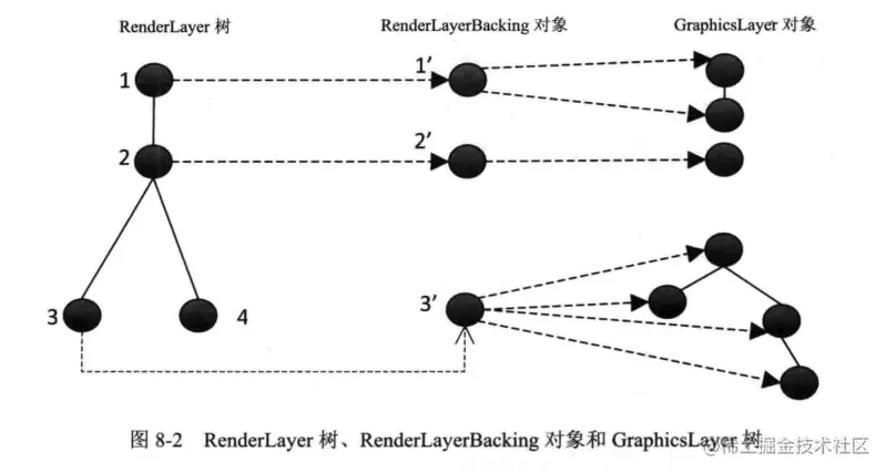 图8-2描述了RenderLayer树、RenderLayerBacking对象和GraphicsLayer树这些硬件加速基础设施的对应关系。每个RenderLayerBacking对象,至少需要一个GraphicsLayer对象。